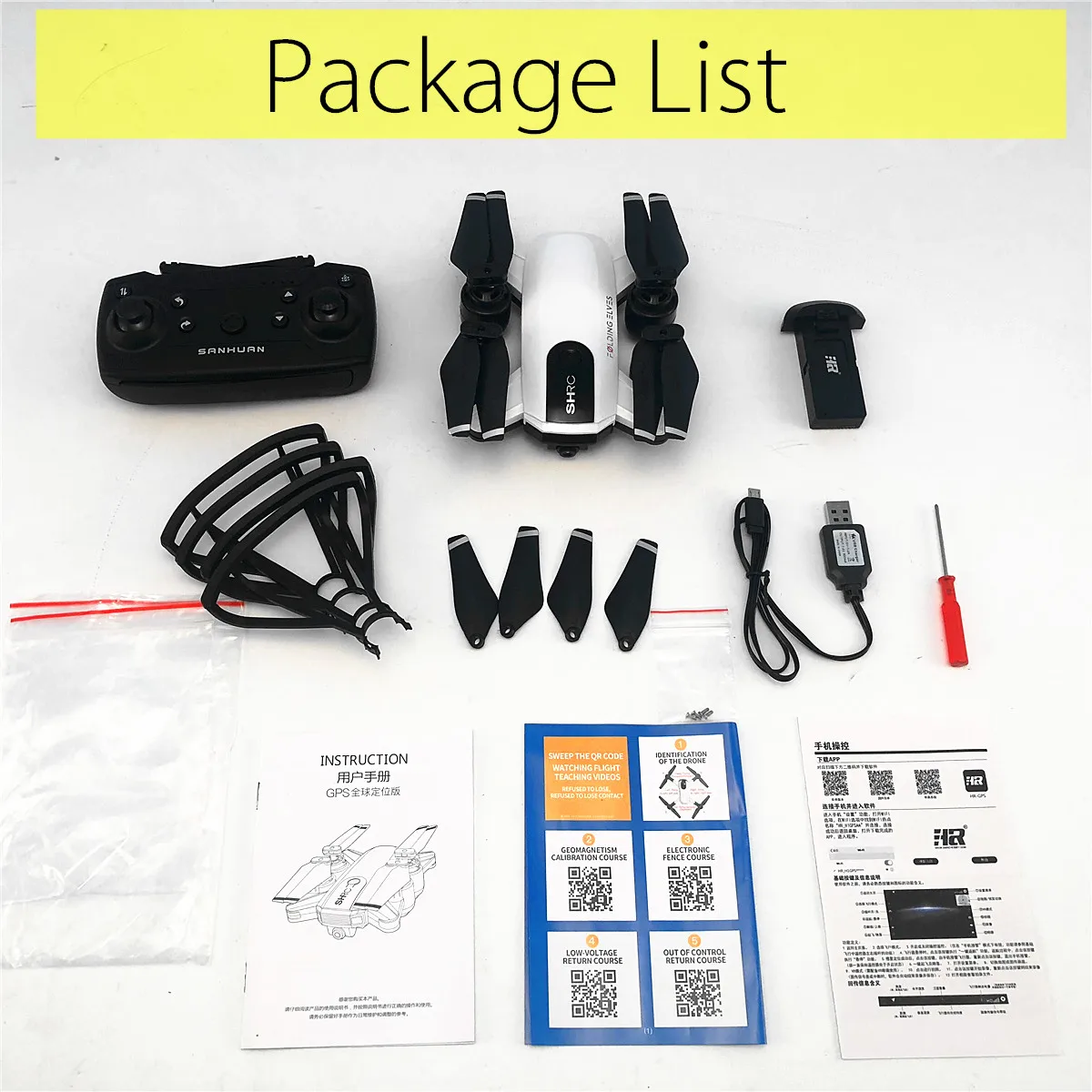 Package Included: 1 x aircraft 4 x fan blades 4 x guards 1 x remote control (without battery) 1 x screwdriver 1 x USB charging cable 1 x user manual
