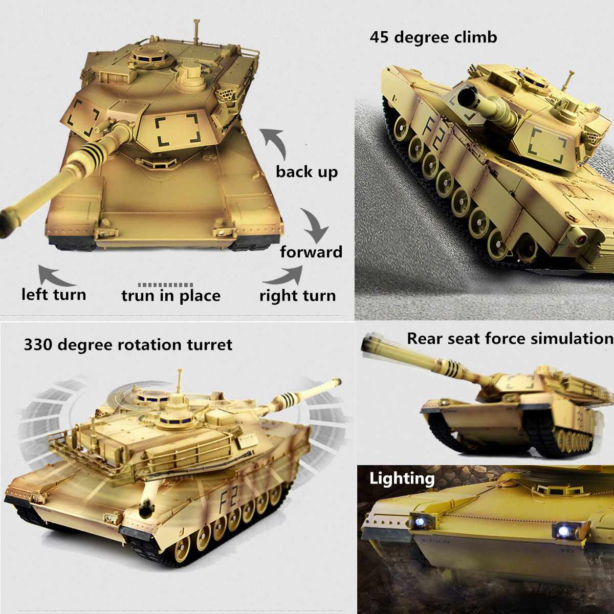 -Tank Mobility: forward, back up, turn, turn in place, move aiming shot, 45 degree climb, true recoil simulation