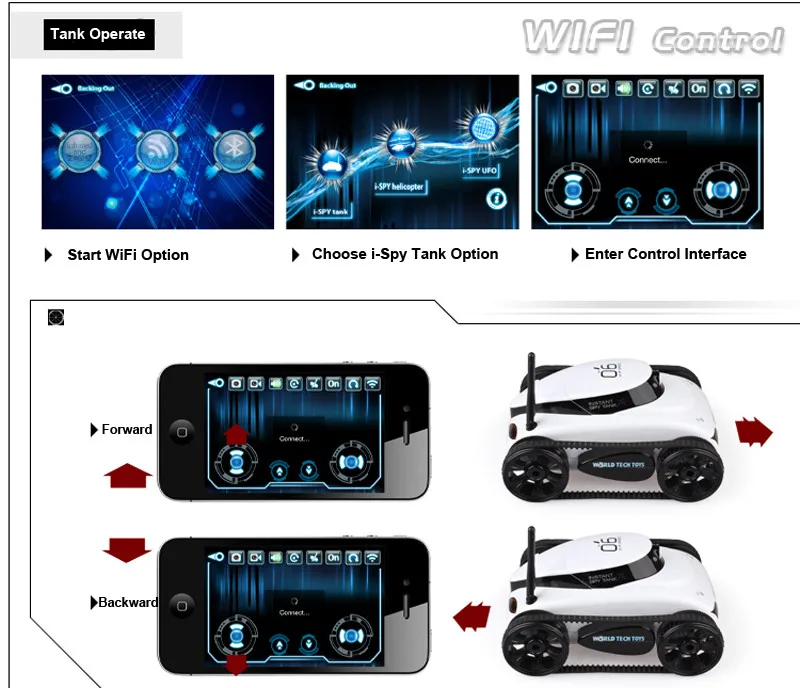 RC tank series full action remote control can move forward, backward, turn left, turn right, left and right rotation, camera (20 meters), real-time photographic, video transfer,for iphone, for ipad, wifi as a remote control to operate than traditional remote control operationmore simple and convenient.