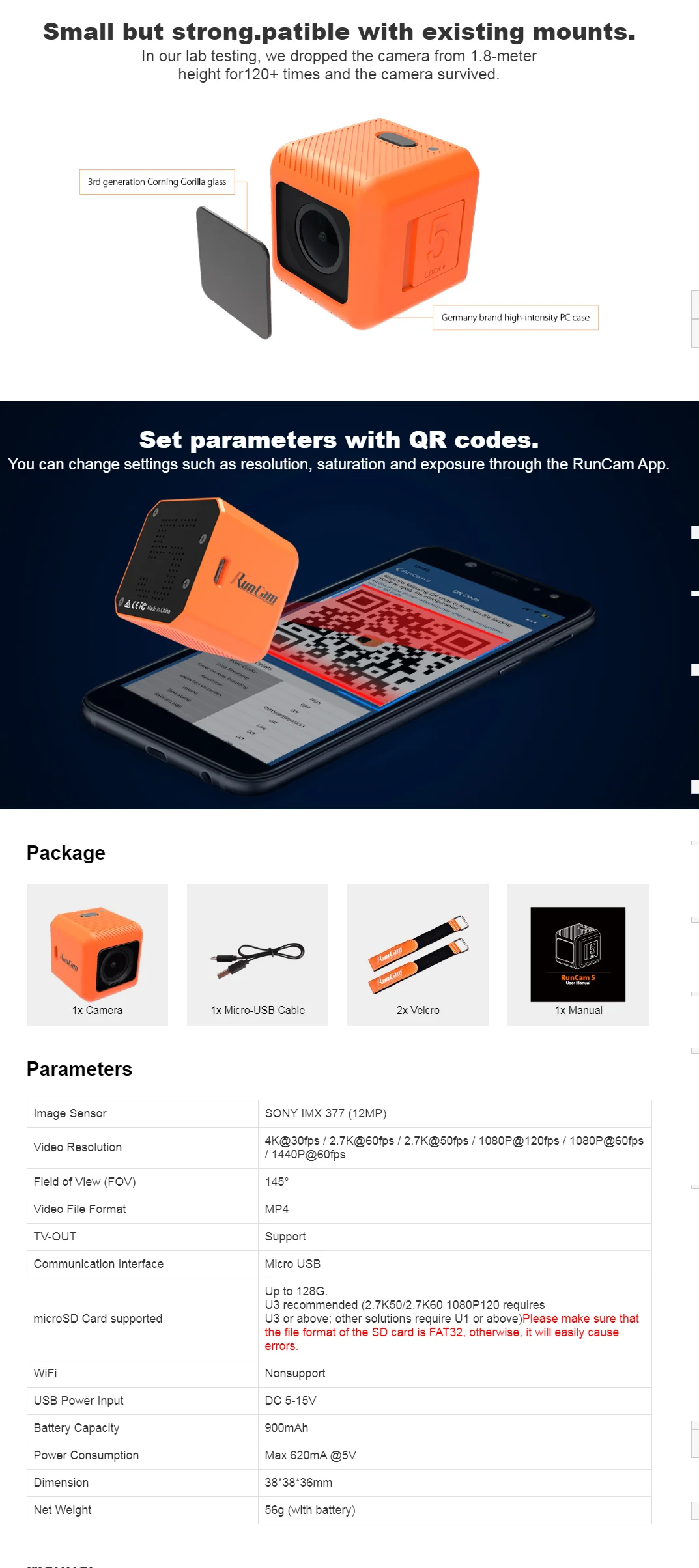 Specification: Image Sensor SONY IMX 377 (12MP) Video Resolution 4K@30fps / 2.7K@60fps / 2.7K@50fps / 1080P@120fps / 1080P@60fps / 1440P@60fps Field of View (FOV) 145° Video File Format MP4 TV-OUT Support Communication Interface Micro USB microSD Card supported Up to 128G. U3 recommended (2.7K50/2.7K60 1080P120 requires U3 or above; other solutions require U1 or above)Please make sure that the file format of the SD card is FAT32, otherwise, it will easily cause errors. Shutter AUTO 1/30 1/60 1/120 1/240 ISO AUTO 100 200 400 800 1600 3200 WiFi Nonsupport USB Power Input DC 5-15V Battery Capacity 900mAh Power Consumption Max 620mA @5V Dimension 38*38*36mm Net Weight 56g (with battery) Package included: 1 x RunCam 5 Orange FPV Camera 1 x Micro-USB Cable 2 x Velcro 1 x Manual