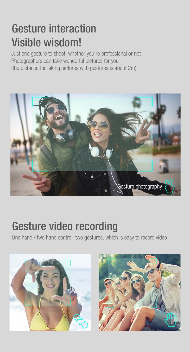 -Gesture photography and recognition: within 1-3 m from the aircraft, make photographic gesture/photographic gesture in front of the camera.