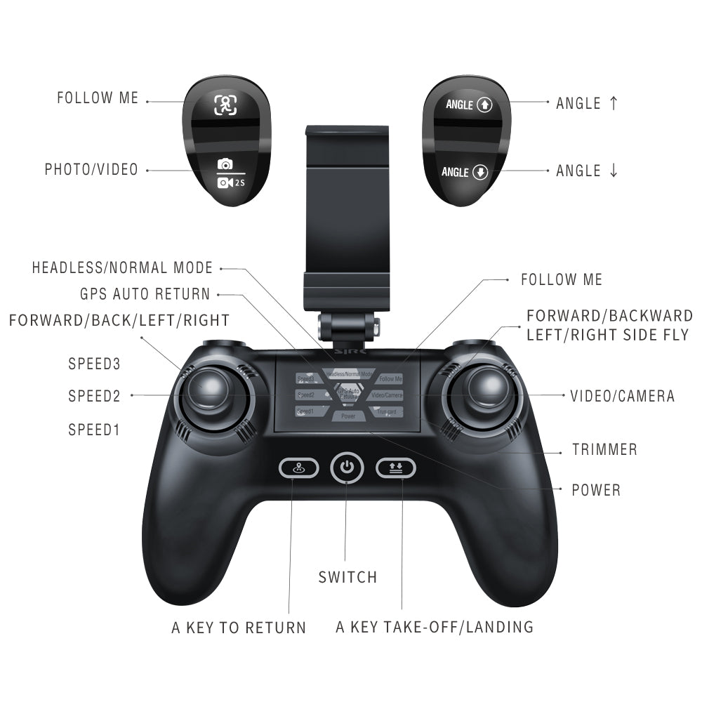 Slide on the screen with your fingers,you can set S30W flight path,When disoriented,you can adopt the headless mode,Summon drones back just one key,hold all hands.
