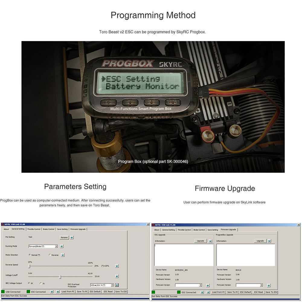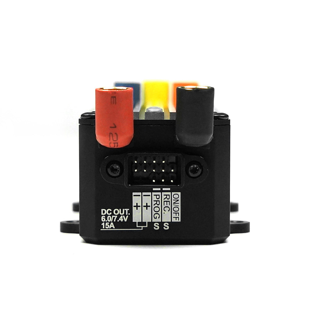 Built-in high power BEC. The built-in BEC Output voltage is selectable between 6.0 V and 7.4 V and with 15A Maximum output current.